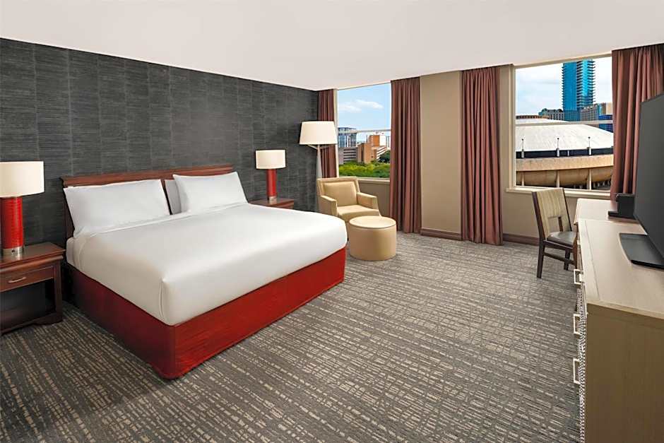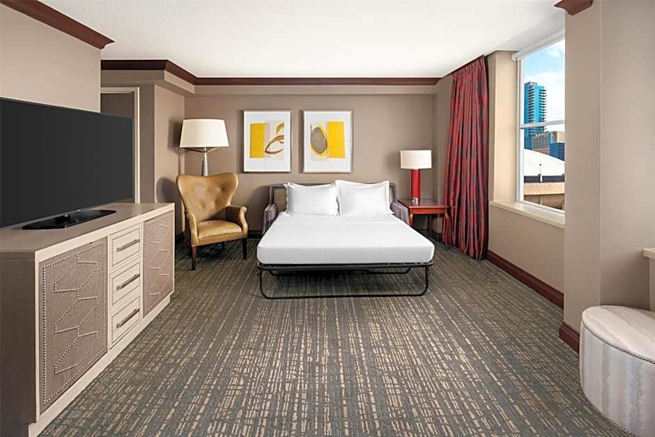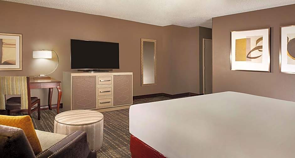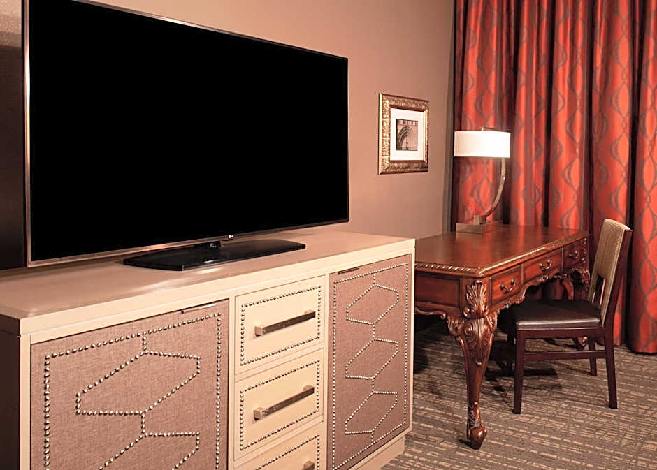 A seating area with a flat-screen TV is featured in this room. A work desk and coffee machine are included.